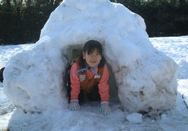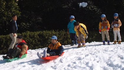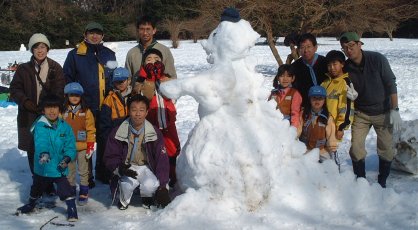 1月28日(日)隊集会「雪にチャレンジ」 冬のハイキングは「雪にチャレンジ」です。年が明けてから隊長は富士山や箱根や丹沢方面を下見して、最終的に「ヤビツ峠」のハイキングを計画しました。 ところが、26日から関東地方に大雪が降り、とてもじゃないけど山登りは不可能な状況となりました。 そこで、中止になった10月のハイキングのプログラムを活かして、県立東高根森林公園へのハイキングに切り替えました。 武蔵小杉駅に集合して久地駅まで移動し、久地駅からウォークラリーで公園まで歩きました。 天気が良く、ビーバーは汗をかくほどでした。 公園に着いたら、外周歩道を自然観察ハイクをしながら半周し、ピクニック広場で雪合戦をしました。 それ から、小山に移動してそこでそり滑りを楽しみました。芝生広場に行くと一面の雪原となっていて、その上にブルーシートを敷き、お弁当を食べました。 暖かいポタージュスープが配られ、皆喜んで飲みました。 お昼が終わったら、みんなで雪だるま作りをしました。 特大の雪だるまを作ったのですが形がいびつになってしまいました。そこで誰かが一言 「ゴジラみたい」 そこで、雪だるまは「雪ゴジラ」になりました。 女の子達が作った雪のトンネルを大きくしてかまくらにしました。 ![]() 本当に中はビーバーが二人入れるほどのかまくらができました。 お父さんたちが子供に帰って、一緒に雪遊びを楽しんでくれました。 大雪の後、ぽかぽかと暖かい日差しに恵まれ、思いっきり雪遊びを楽しむことができました。 |
