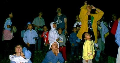 | 6月16日(日)隊集会「蛍狩り」 恒例の蛍狩りです。 今年は桜の花が遅かったように蛍も遅く、隊長が前日下見に行った時点ではまだ、2〜3匹しか飛んでいませんでした。しかし、この日、夕方、集合して、緑地内の機関車などの見学をしたあと、蛍の谷に行くと、夜がふけるにしたがい、ひとつ、ふたつと蛍が増え、7時半から8時ごろには数十匹の蛍が谷間の木の下闇に光を明滅させる様子を見ることができました。 |
